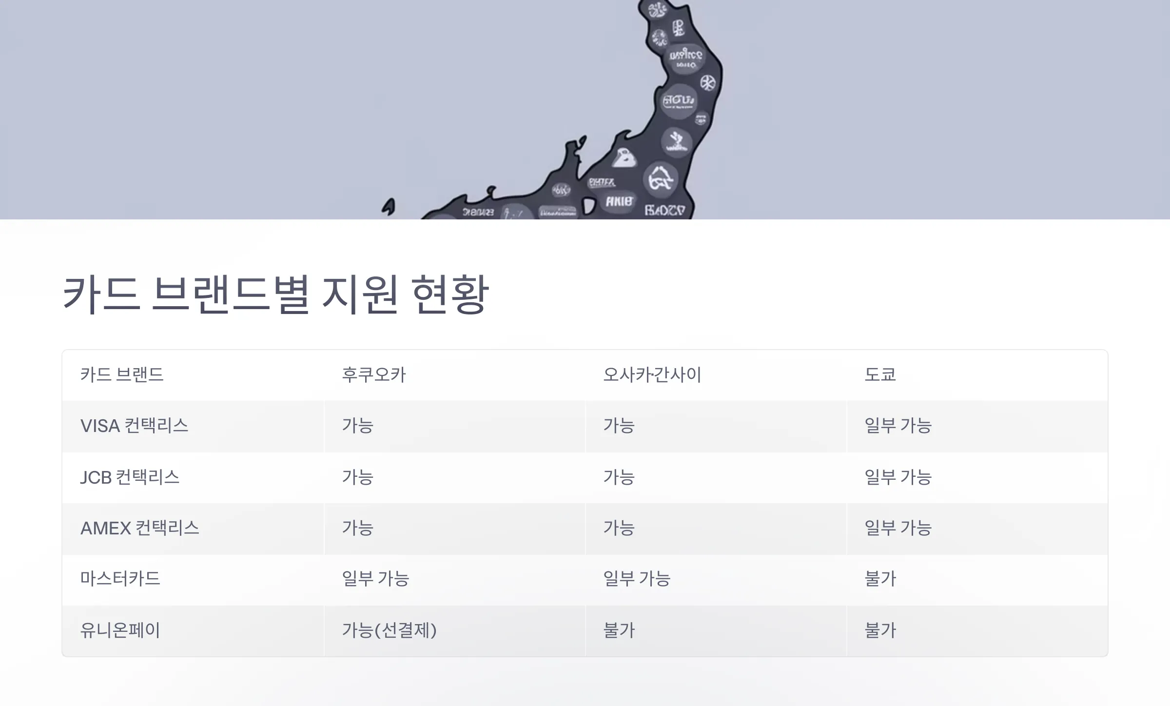 비자(VISA) 및 JCB 카드 지원이 확대되고 있으며, 일부 구간에서는 애플페이, 삼성페이도 사용 가능