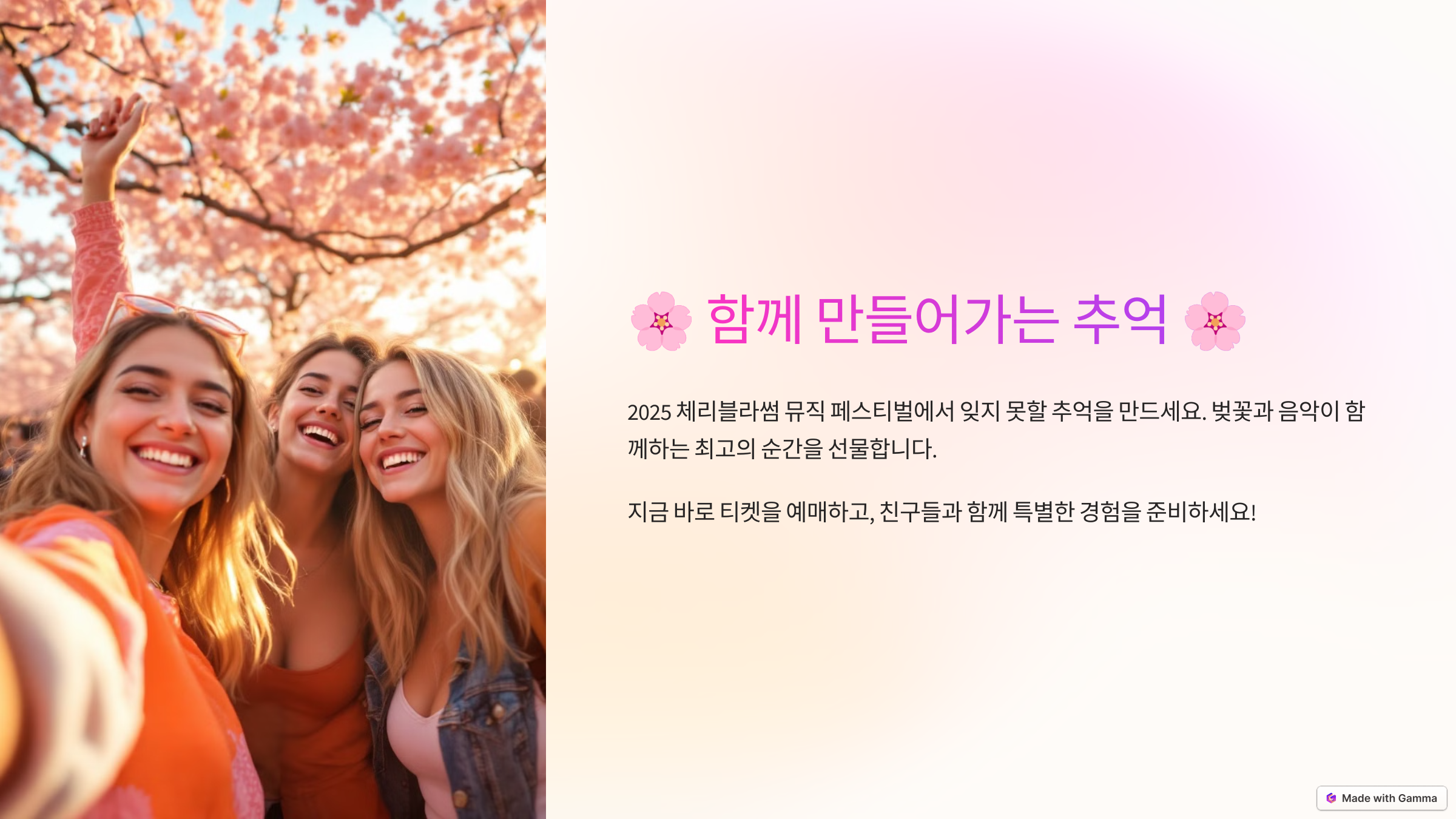 이번 2025 체리블라썸 뮤직 페스티벌은 벚꽃과 음악을 동시에 즐길 수 있는 특별한 경험이 될 것입니다. 미리 일정을 체크하고, 티켓 예매를 서둘러 최고의 봄날을 계획하세요!